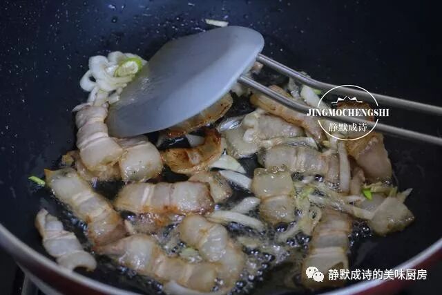 3、热锅热油,小火煸炒五花肉,把肥油逼出来,再加入葱花炒香。