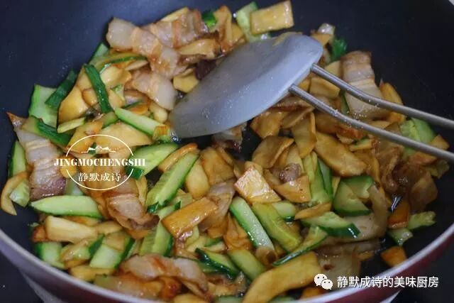 6、加入黄瓜片,加入少许盐,快速炒匀后关火。黄瓜片的加入,既增加了维生素的摄入,也丰富了这道菜肴的口感,还能起到清新解腻的作用,真可谓一举多得。