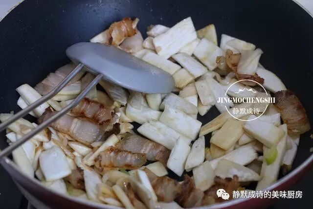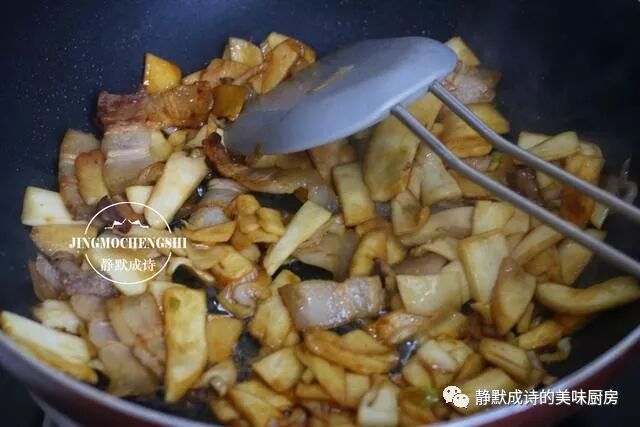 4、加入杏鲍菇,中小火不断翻炒,到杏鲍菇变色发软,不必加水,杏鲍菇会出汤汁。