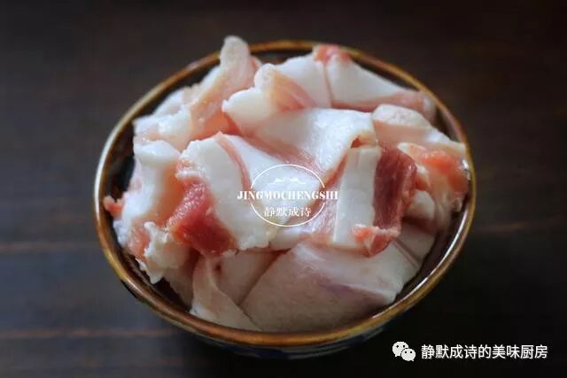 2、五花肉切薄片,然后再切一刀,大小尽量与杏鲍菇和黄瓜片相当。肉无需多放,有几片即可,我们主要取其油脂和味道。