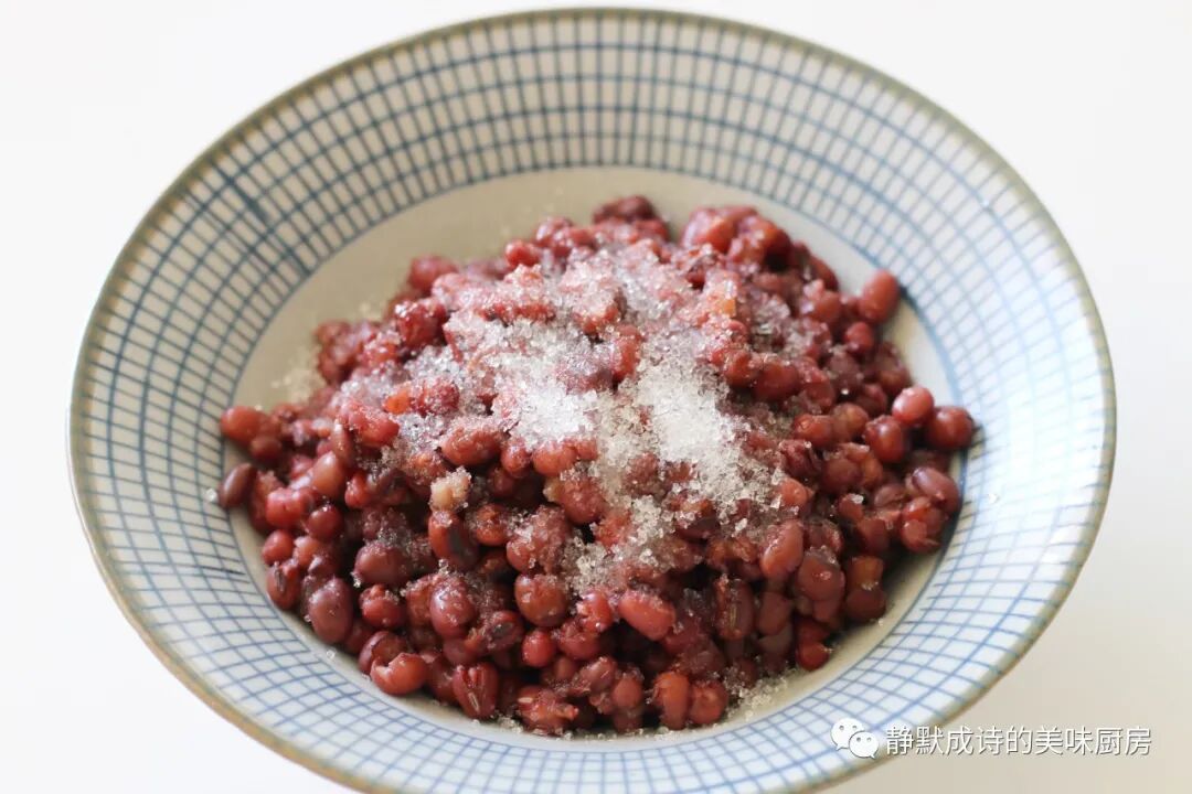 2、第二天把红豆用压力锅压熟,不要压的太烂乎,保留些微微的颗粒感更好。趁热把白糖撒上去拌匀。