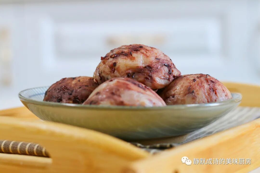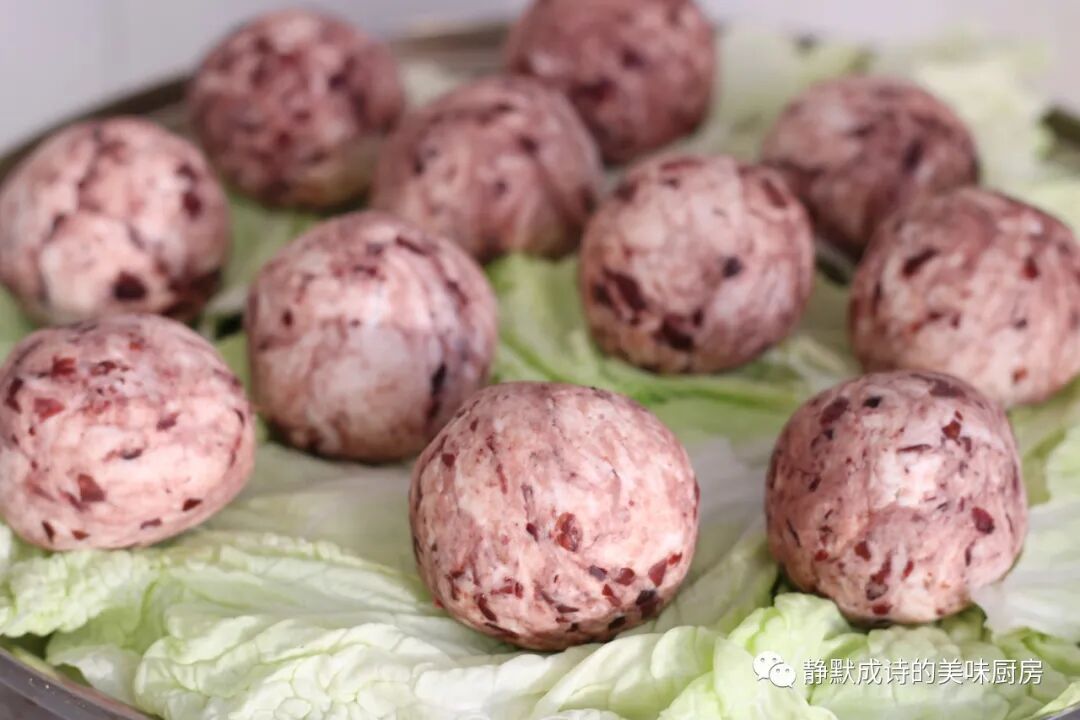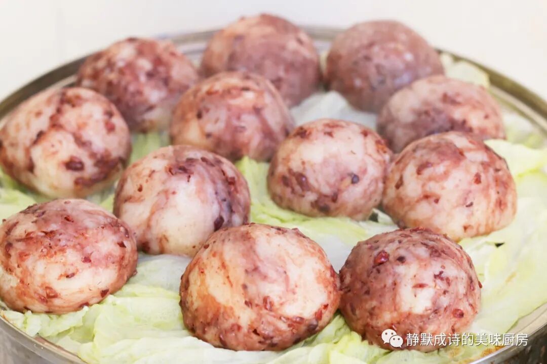 6、蒸锅篦子上铺一层白菜叶防粘,把球状年糕生坯放上去,两个之间要有间隙。