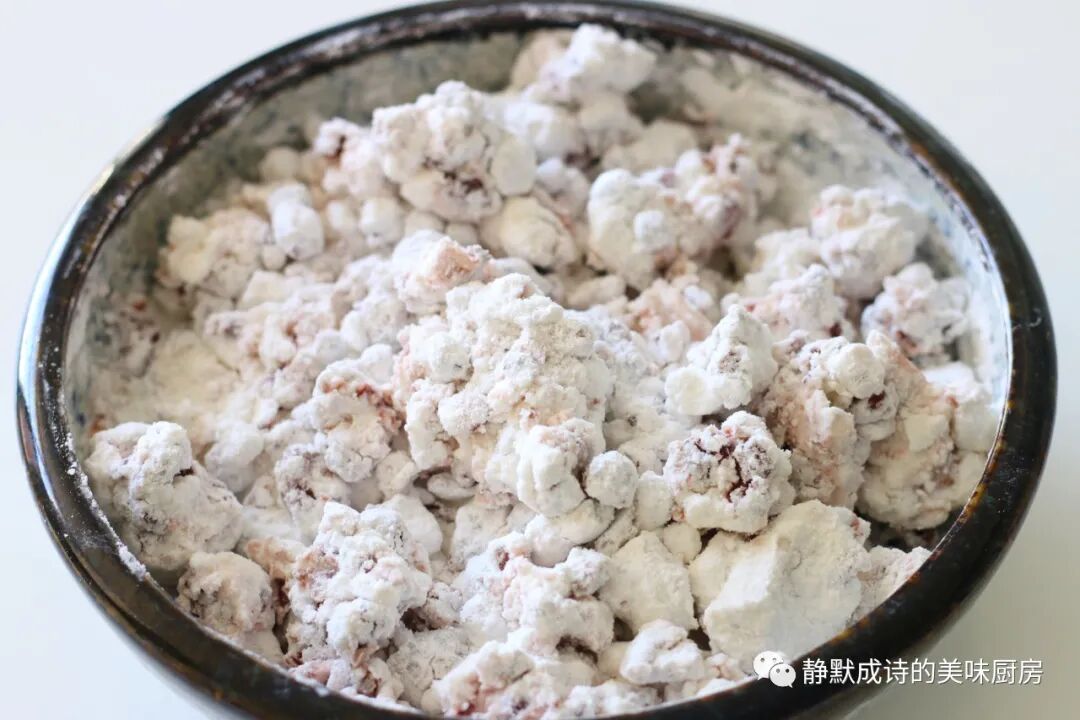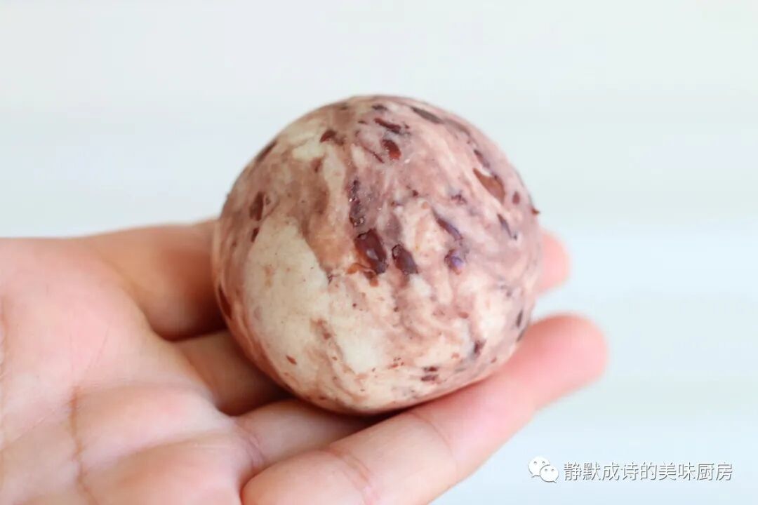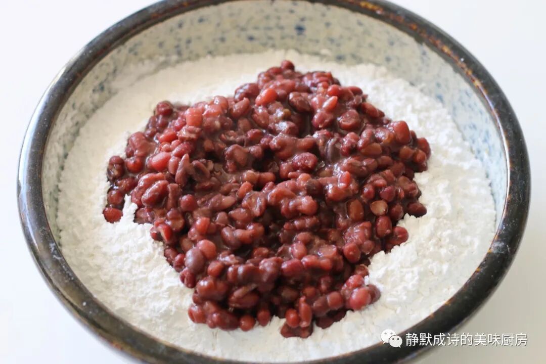 4、搅拌均匀,如果盆中有明显的干粉,就加煮红豆的水,直到能攥成团即可。这个过程是整个食谱中最关键的地方,粉能成团即可,不能过湿。