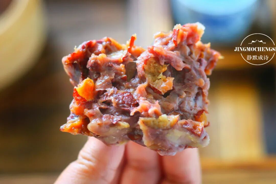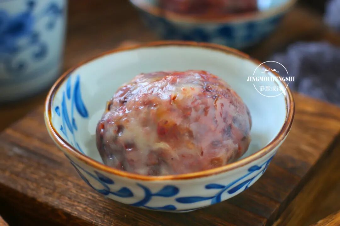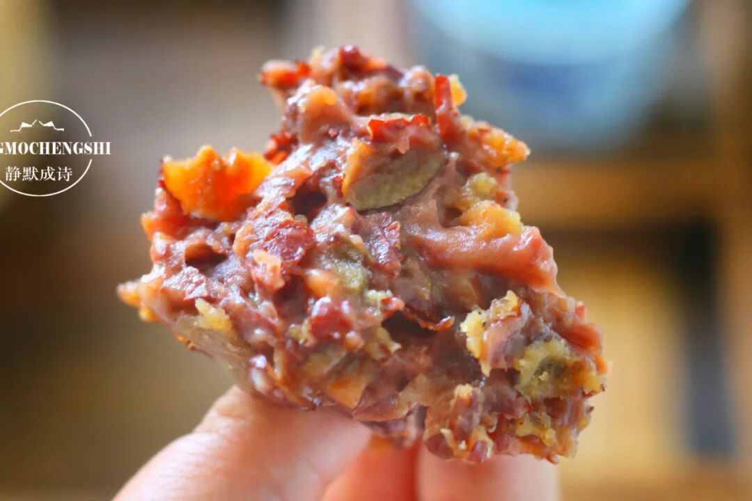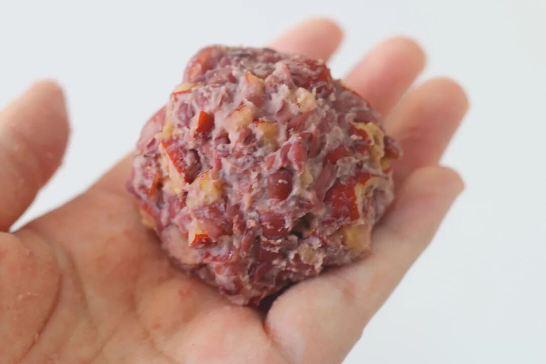 8、下手抓起一小把红枣红豆馅儿,在手中捏成圆团。