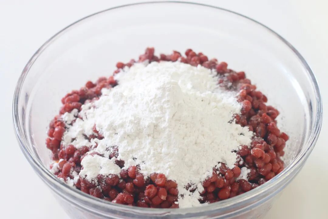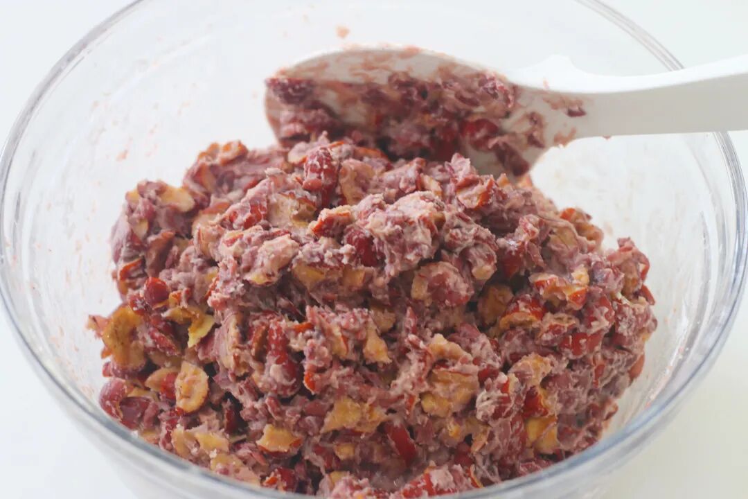 6、待红豆压熟之后,把它捞进装红枣碎的大碗中,加入适量的糯米粉以便让红枣红豆馅儿能够捏成团。想让这个杂粮包的口感更糯一点的话,就多放一些糯米粉。