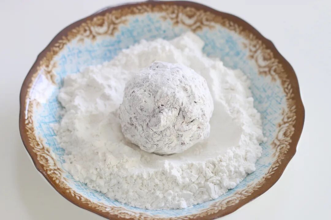 9、然后把它放在糯米粉中滚一滚,让它周身均匀地沾上一层糯米粉。如果觉得一次不行,就把粘了糯米粉的圆团快速地在清水中蘸一下,再裹一次糯米粉。