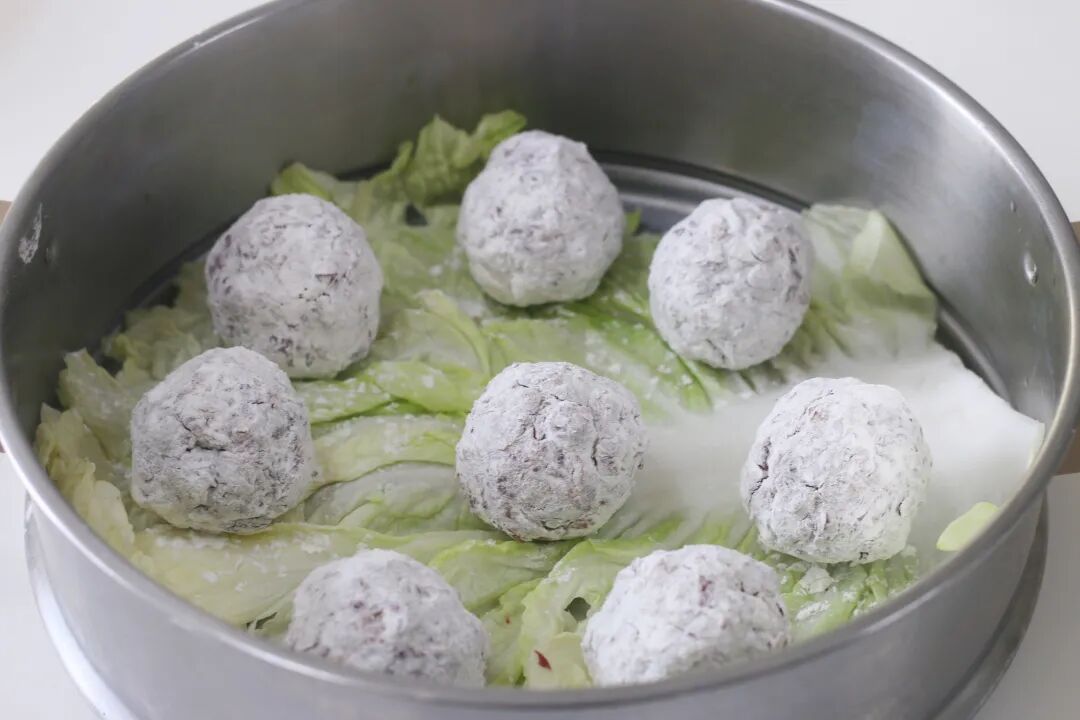 10、蒸锅上铺白菜叶防粘。大家记住,凡是蒸糯口食物,都铺菜叶来防粘,省事儿省力。把滚过粉的杂粮包放在菜叶上,中间要有间隔。