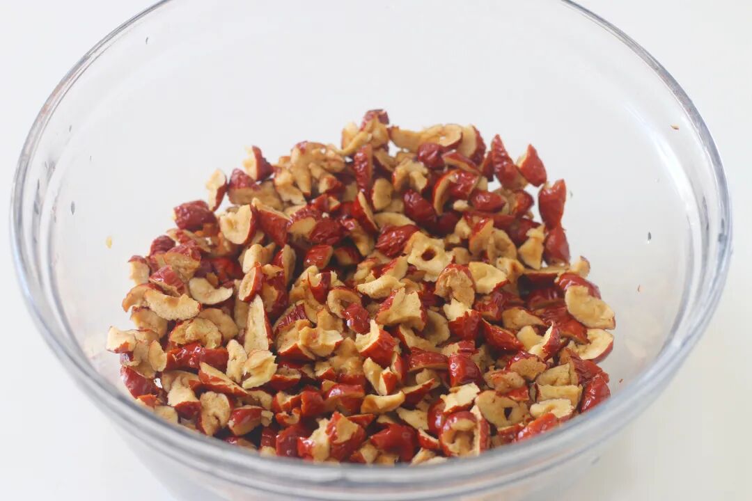 5、把红枣快速地清洗干净,然后沥水。用厨房剪刀把红枣剪成小碎块儿。放了红枣,我们做这个杂粮包就不必放糖了,吃着会更健康天然。