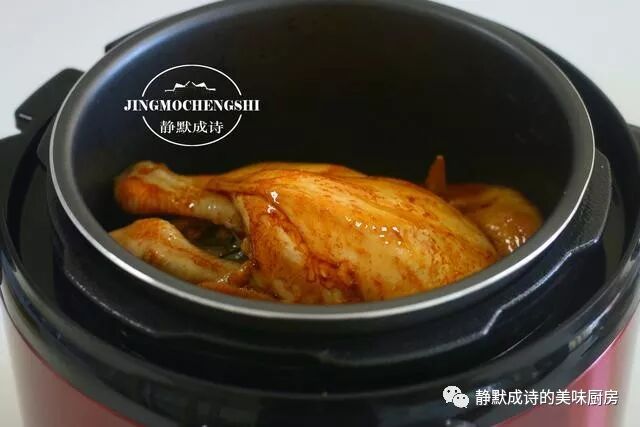 6、拿一只大碗,把鸡放进碗中,再把碗汁儿全部倒进去,给鸡全身来个按摩上色,然后放进高压锅。