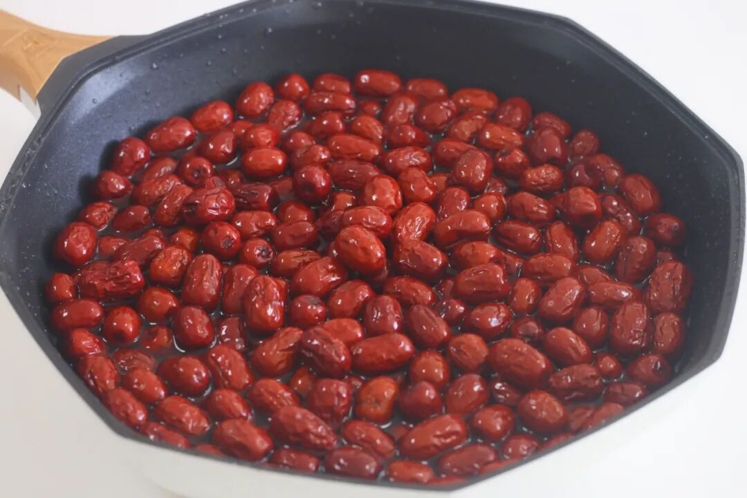 4、红枣冷水下锅煮。红枣一定要煮过才能用,再柔软湿润的红枣也要煮,这步不能省略。