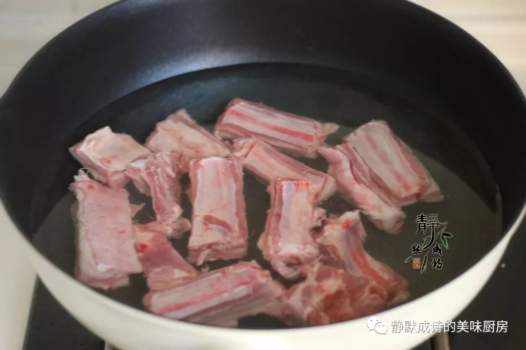 3、羊排冷水下锅(水要宽),大火烧开。一定要冷水下锅,这样才能逼出羊排中的血水。