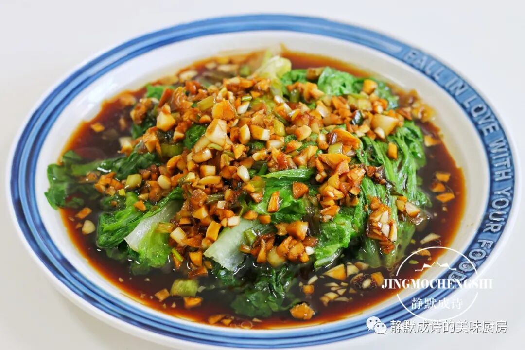 这道菜,我想不必多讲,好多人都会。但做这道菜有两个要点要记住:生菜浅浅地焯一下水即可,保证它的口感脆嫩;再一个,放多多的蒜末,热油激香后蒜香味儿浓郁,很是可口。