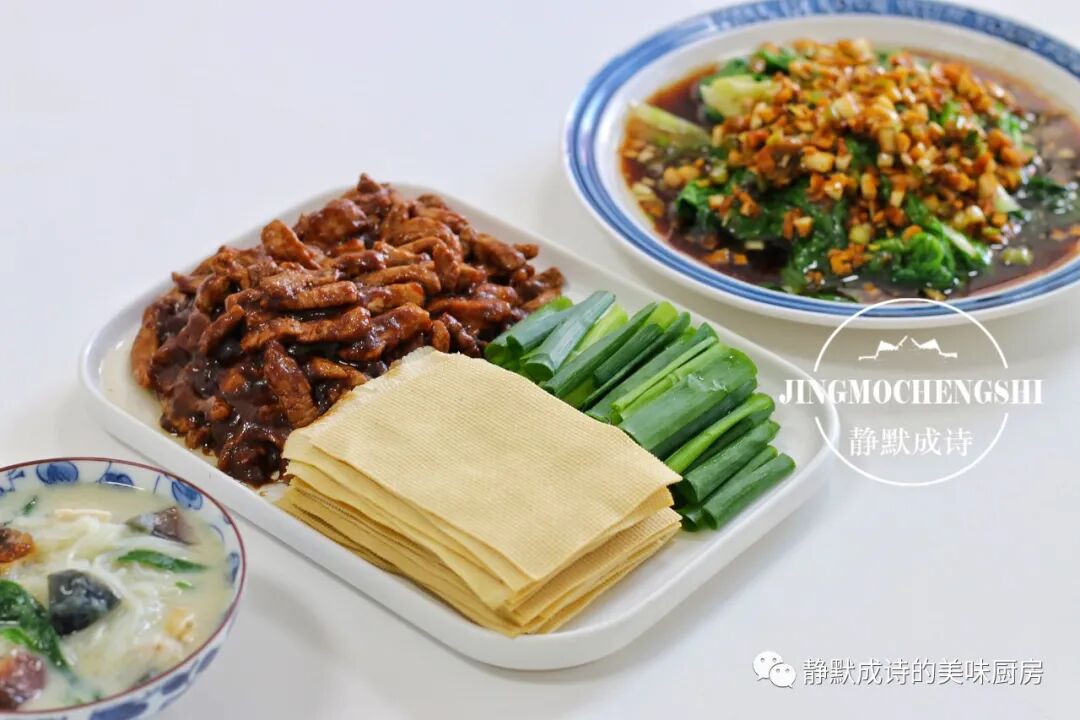 这是一道家常菜,而且我的做法也是极其简单,只要看一遍做法,人人学得会。豆腐皮儿焯一下水去掉豆腥气,然后改刀成长方形,同香葱段或是黄瓜丝一起码到盘中;把猪瘦肉切成丝或条(因为用鲜肉切的没提前冷冻,所以请忽略我的刀工),准备好调味汁:白胡椒粉、少许盐、少许淀粉、一点点生抽,加入少量清水,搅拌均匀即可;热锅凉油,先把猪肉丝(说丝,我会笑)小火煸炒至颜色变白,然后盛出待用;重起油锅,下甜面酱不停翻炒至出味,再倒入肉丝翻炒,最后把调味汁淋进去收汁即可出锅。用豆腐皮儿卷着吃,香而不腻。