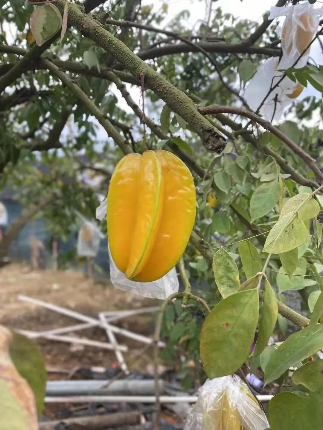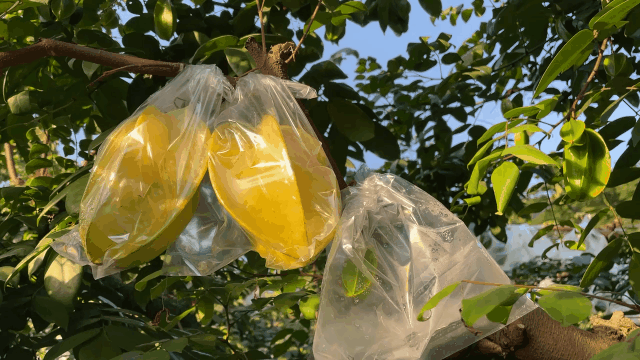 树上熟的果子包着塑料袋,既可以防止病虫害的侵袭,还可以阻挡一些灰尘,所以拿到的杨桃只需简单清洗一下就可以大口大口吃!