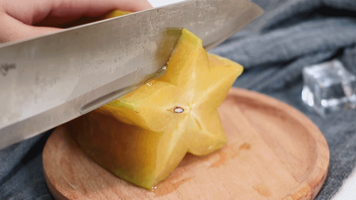 ① 杨桃不需要削皮,洗净直接食用,用刀切掉头尾,削掉五个硬边(只需要削掉较薄的硬边即可),然后用刀切成五角星片,就可以食用了。