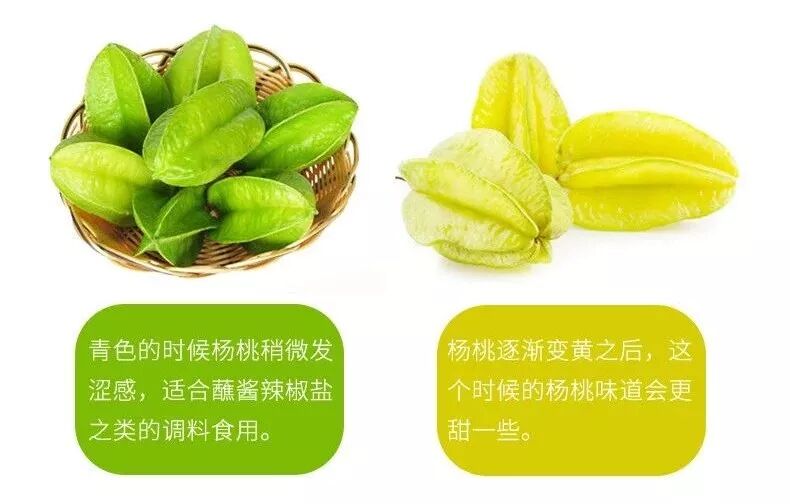 有些人看到杨桃是青的会以为没熟,其实不是的,青色时较爽口清脆吃,待到变黄后口感更佳且甜口。
