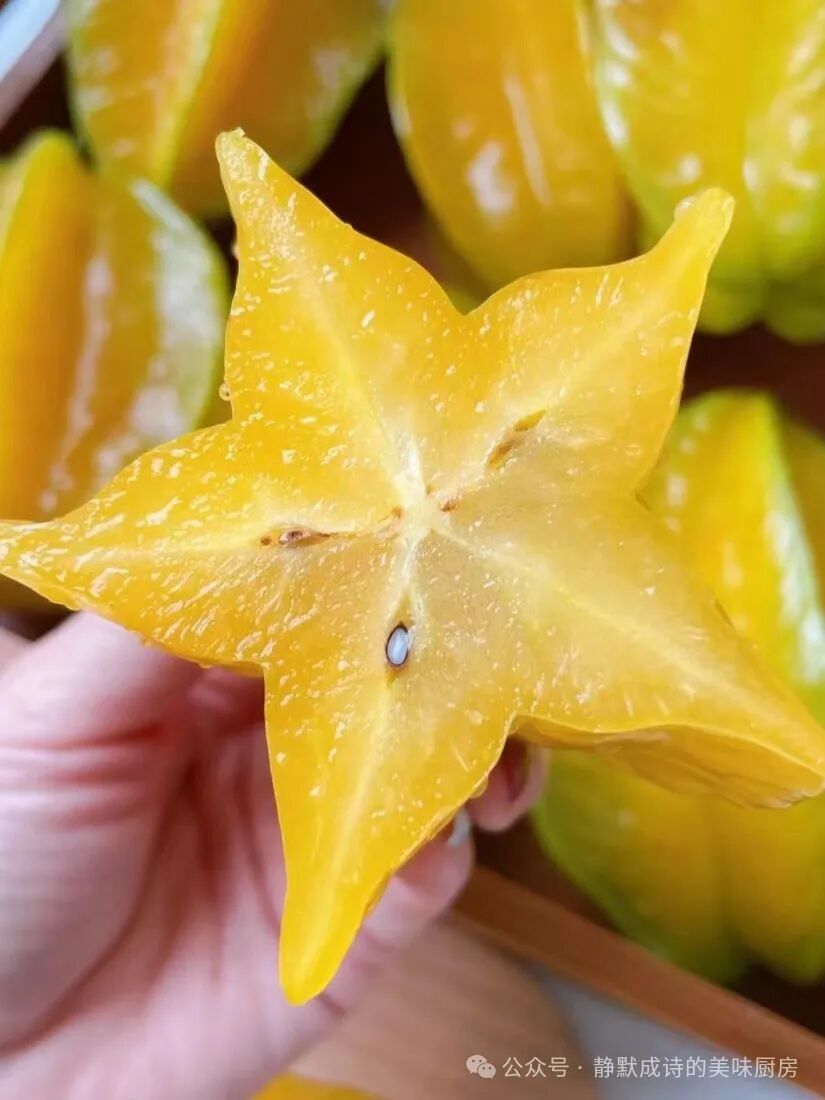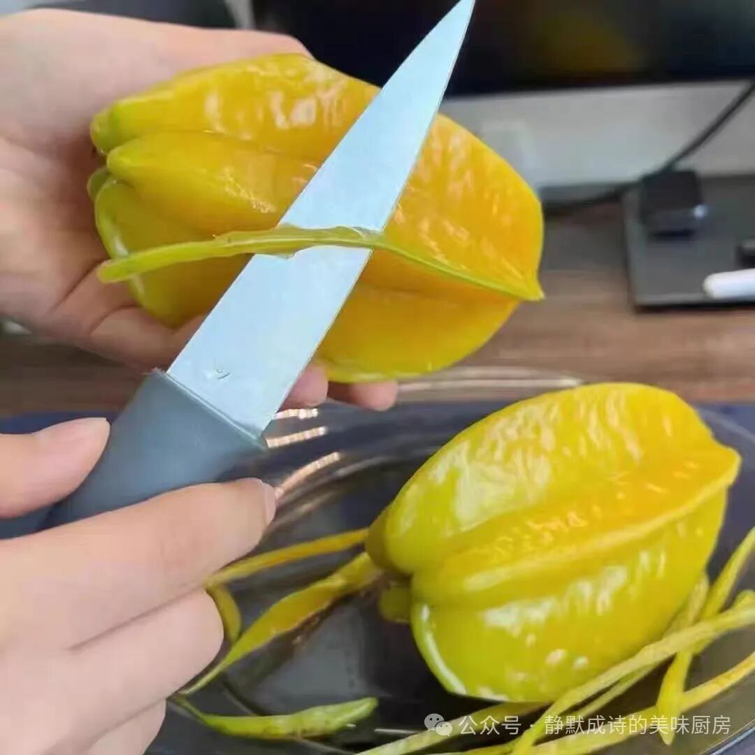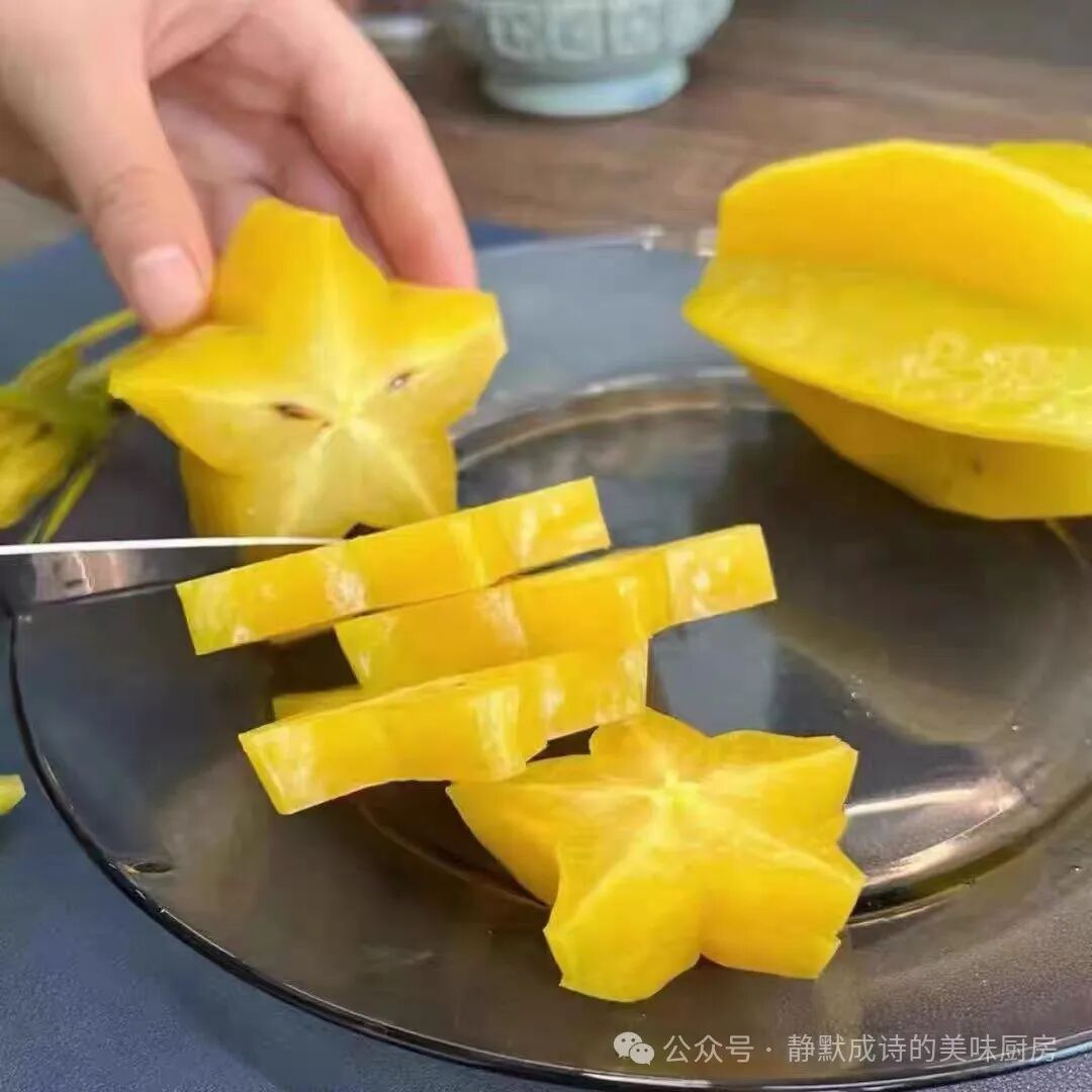 杨桃生吃,没吃过的人可能不懂怎么吃,我来告诉大家。把杨桃洗净后,切掉头尾,再把棱角切掉,然后横切成片即可,漂亮的五角星就出现了,非常适合摆盘凹造型。