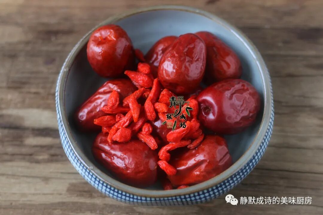1、红枣和枸杞分别清洗干净,沥水待用。这里要提醒大家,红枣根部的小硬蒂一定要去掉,不然它跑进肠胃里,会扎肠胃。