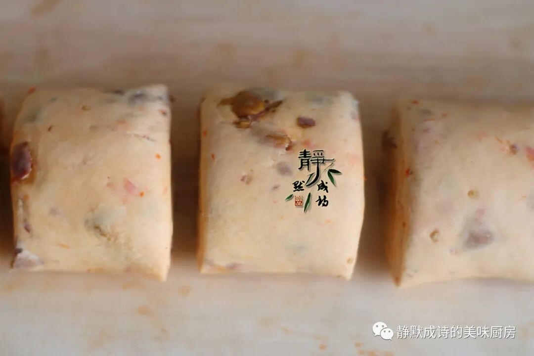 9、切掉两头,然后把余下的部分切成大小一致的馒头坯,如图。