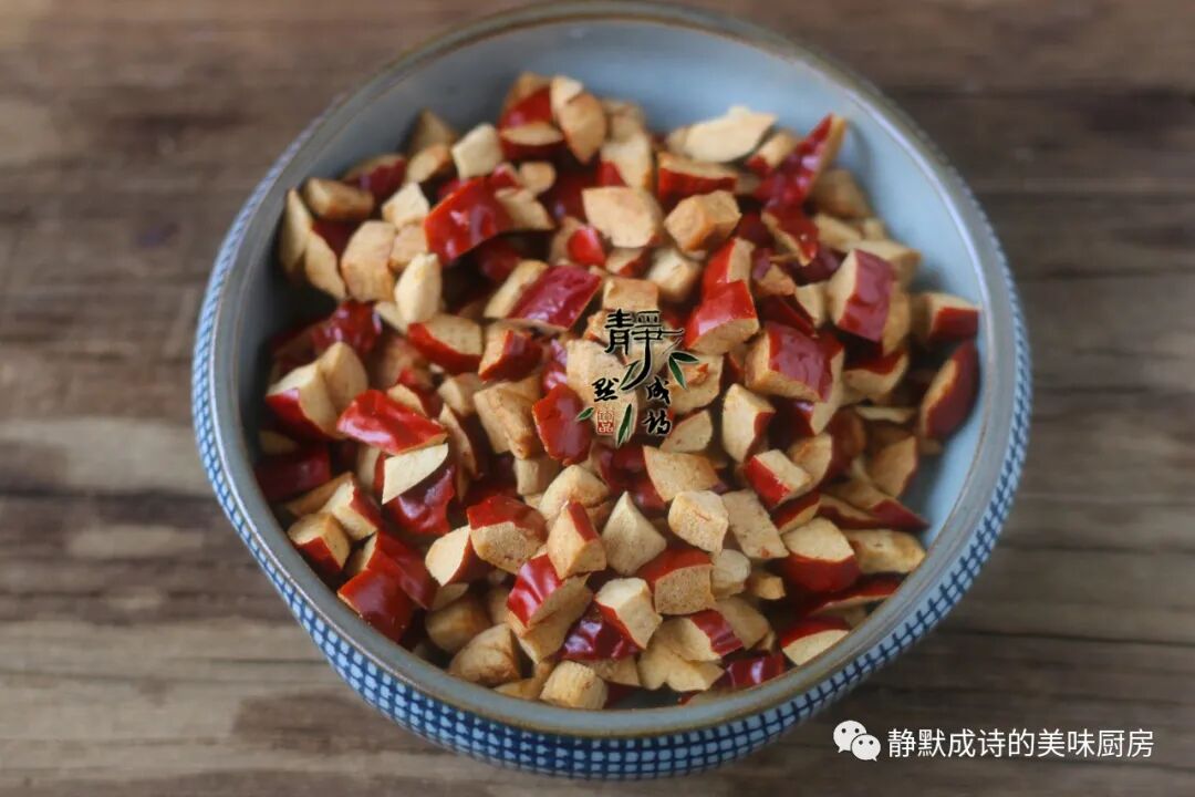 2、把红枣去核,切成小丁待用。红枣选用吃着干湿度正好的那种。