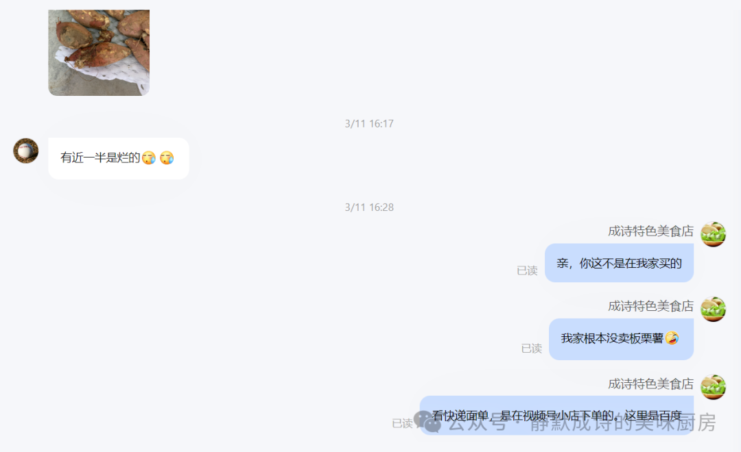 于是我回复:亲,这不是我家小店的产品,我们没卖板栗薯,我们只卖新鲜现挖的红薯,而且,这里是百度小店,您看一下快递面单,您是在视频号小店买的,你得去微信上找到订单然后去售后才对。