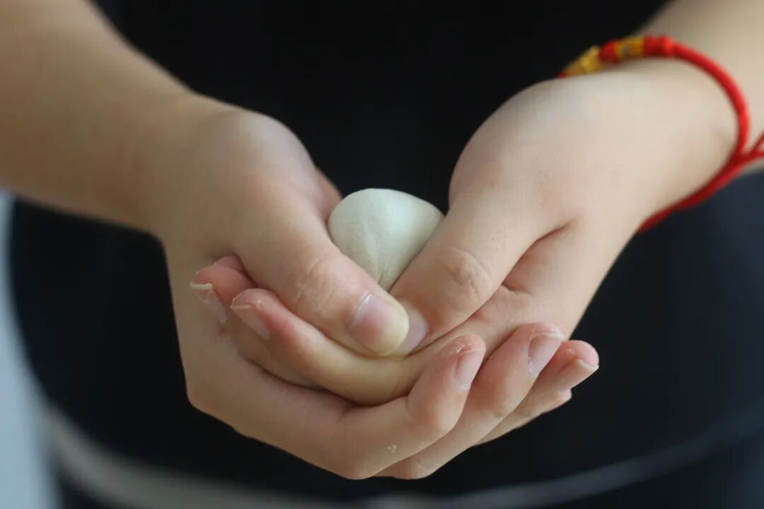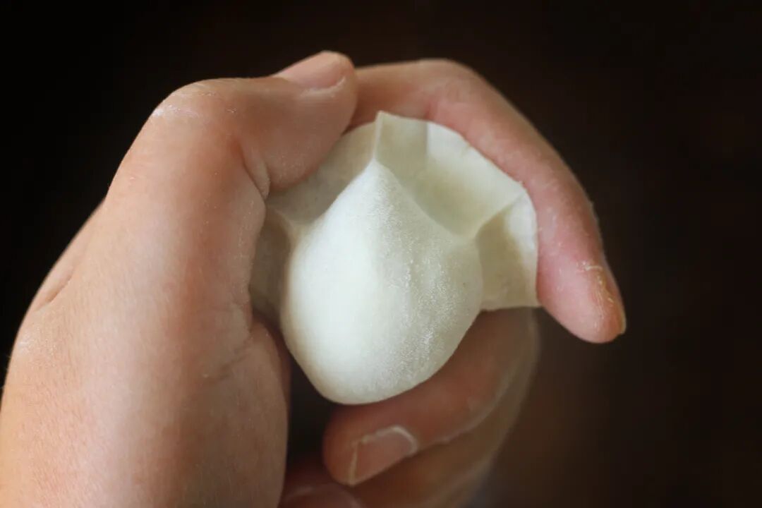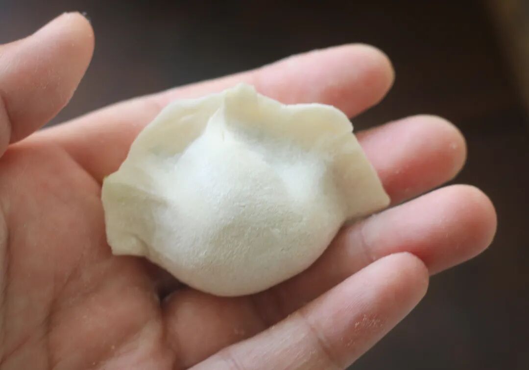6、先把饺子皮折好,中间部分捏住,利用双手虎口位置,把饺子包住,包的同时轻轻向中间挤,饺子的肚子就出来了。