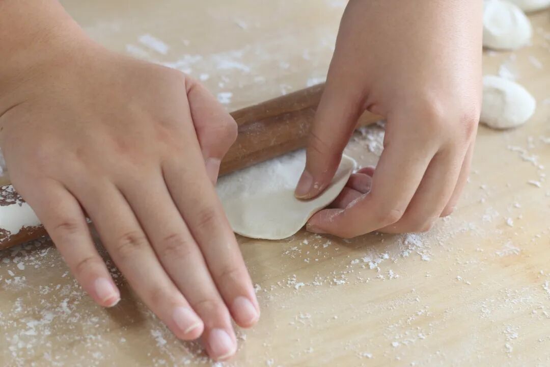 4、把饺子皮儿一一擀好,边缘要略薄,中间要略厚些。