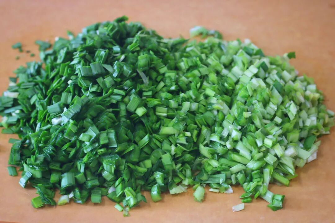 2、韭菜洗净后,一定要把水分控干,待肉馅儿腌制好之后,把韭菜顶刀切碎。韭菜若不是自己家种的,那就把韭菜根部多切掉一部分不要。