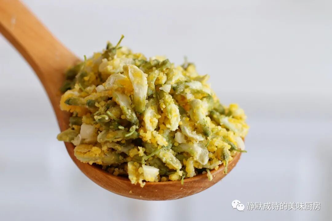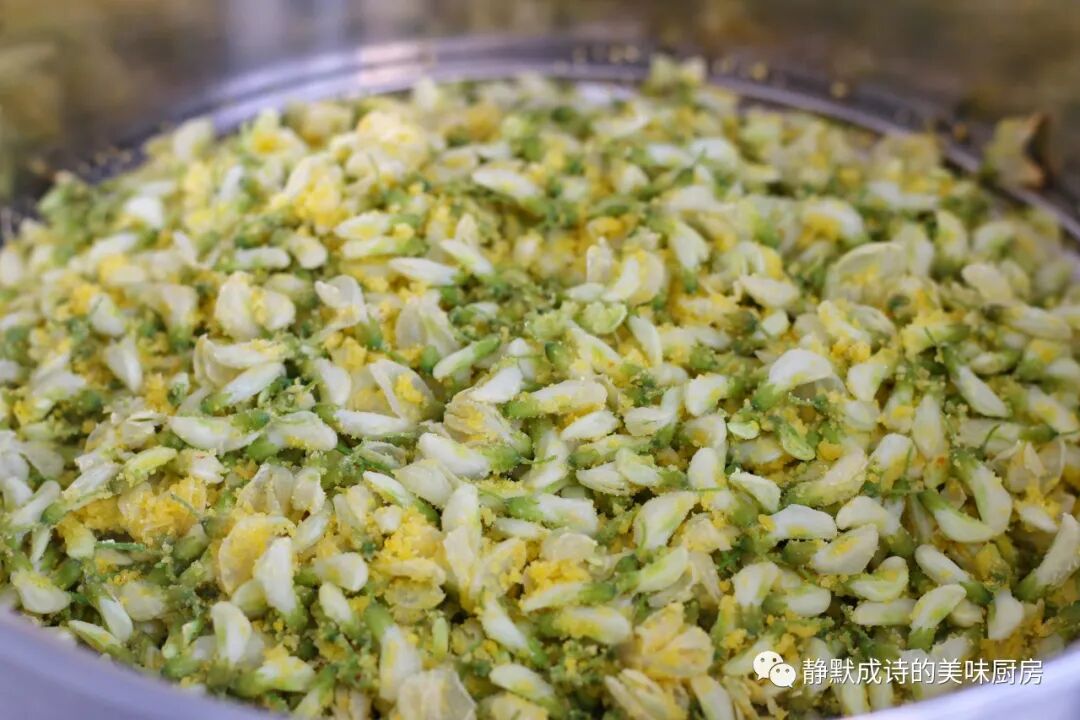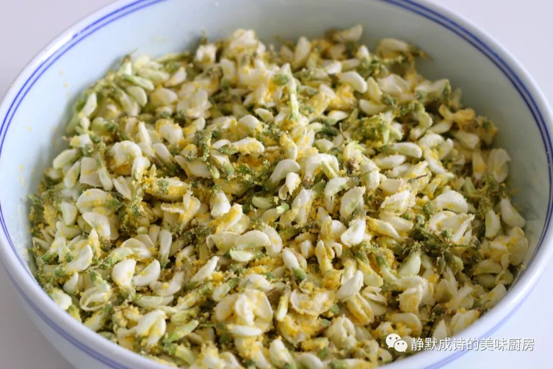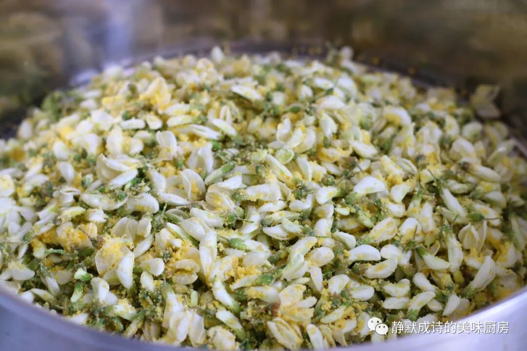 8、这样做的槐花麦饭,既有槐花的清甜清香,也有着淡淡的蒜香,还有玉米的清香,真的很好吃,大家可以试试看。