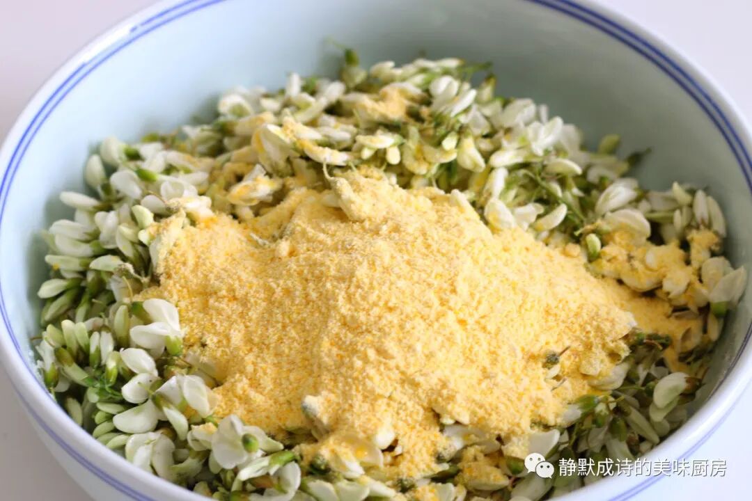 4、用筷子把玉米面粉搅拌均匀,让每一朵槐花都均匀地沾上玉米面粉,薄薄的一层就可以,不要厚重,我们主要是吃槐花。