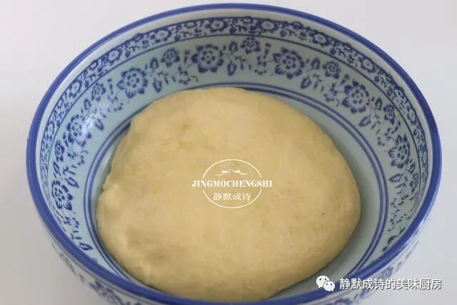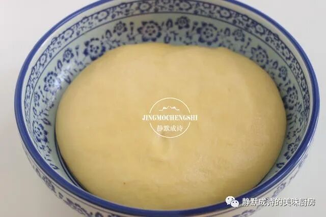 4、接着盖上保鲜膜,把面团放温暖处发酵至两倍大。