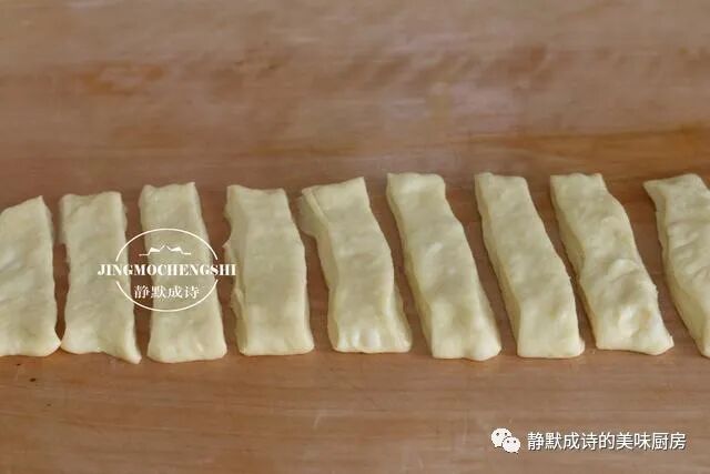 2、油条面发酵好之后万万不可再揉,不然油条下锅膨胀不起来,会炸成实心油条。但是,一旦你忘记了这一点,把发酵好的面团揉了怎么办?也不要急,做好油条生坯之后让它二次发酵也可以补救,二次发酵,仍然是要发至两倍大才可,而且油条生坯最好用保鲜膜盖好,防止它们变干。