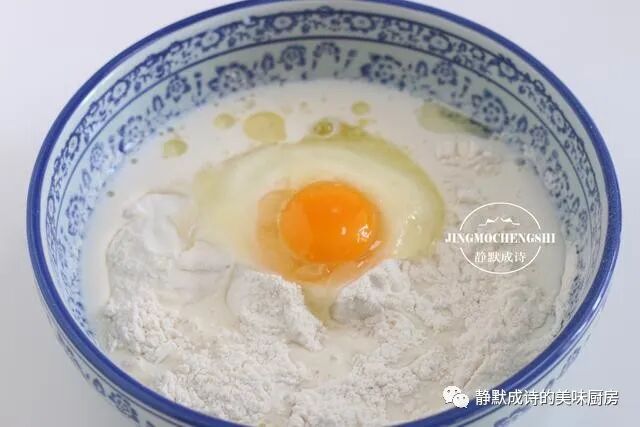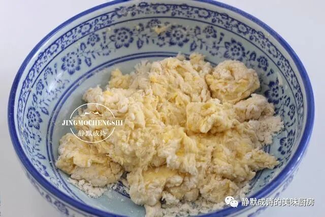 2、一边淋入牛奶一边搅拌,把面粉搅拌至面絮状,说是面絮状,其实它很软,水分大。200克的面粉加了100克牛奶和一枚鸡蛋,液体含量大约在160克左右,所以,刚刚淋入液体时,不要用手,用筷子搅拌,不然太粘手极不容易操作。