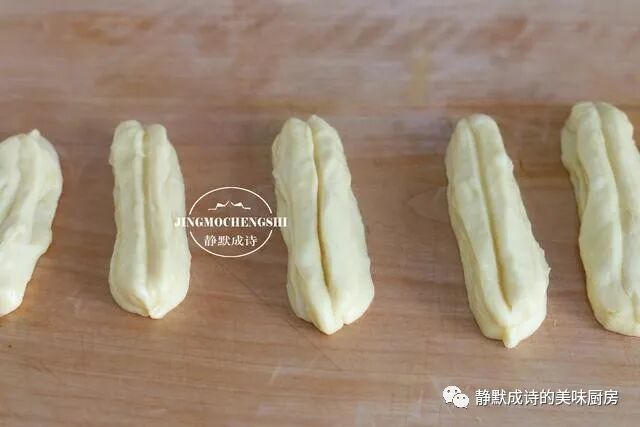 6、两个小条摞在一起,用筷子在中间用力压一下,然后两头要捏紧。筷子痕迹那儿可以再用刀划开,两可,看个人喜好。油条生坯做好之后,不要动它,让它们在案板上松弛几分钟。