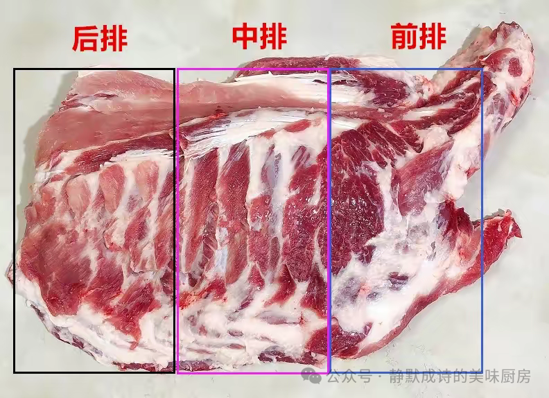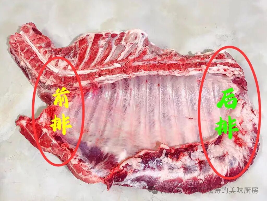 前排:适合做成清蒸排骨、红烧排骨、烤排骨等,容易入味,鲜嫩美味。由于前排的骨头多而软,啃的时候很容易脱骨。