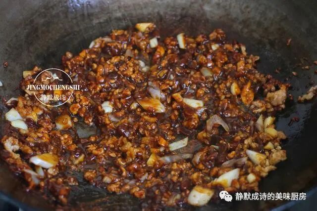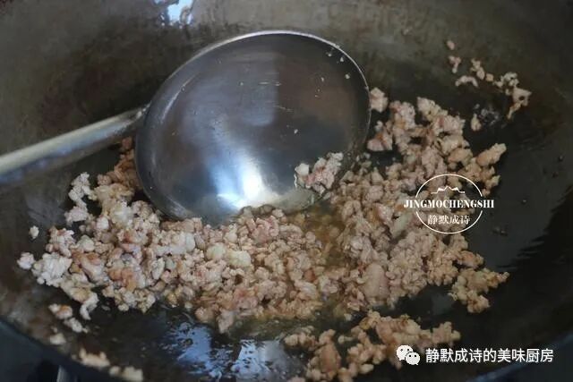 3、热锅凉油,先下肉末,小火煸炒到变色。