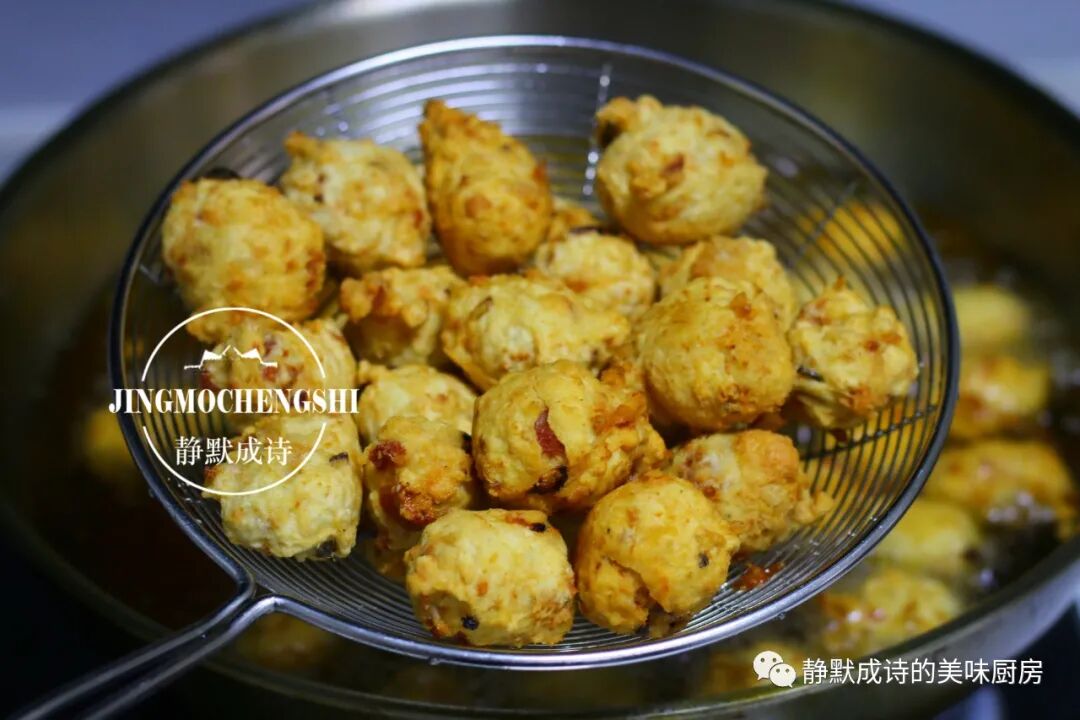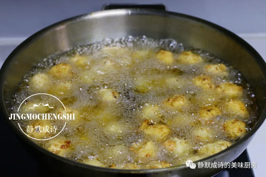 16、丸子浮起后再炸几分钟,至两面金黄色即可控油捞出,然后再继续下丸子。