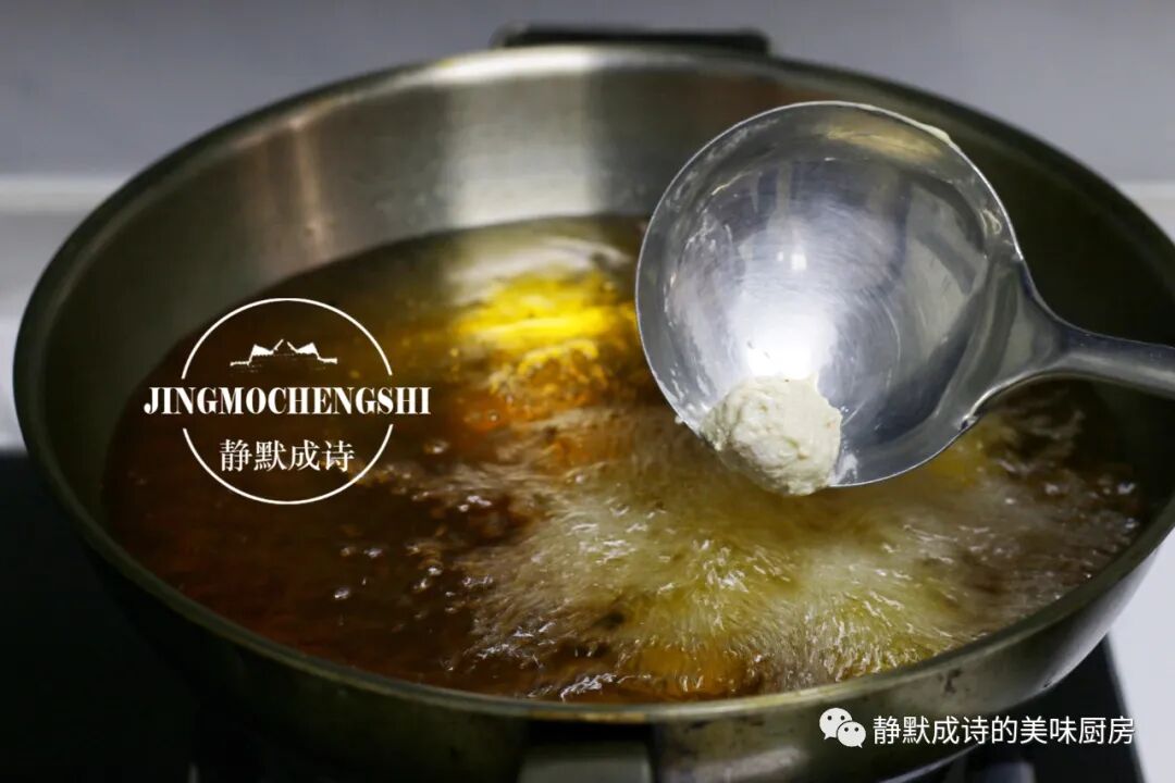 15、往油锅中下丸子时尽量要有间隔,免得丸子粘连。丸子定型后方可搅动,若发现有搂抱在一起难舍难分的,及时把它们分开。