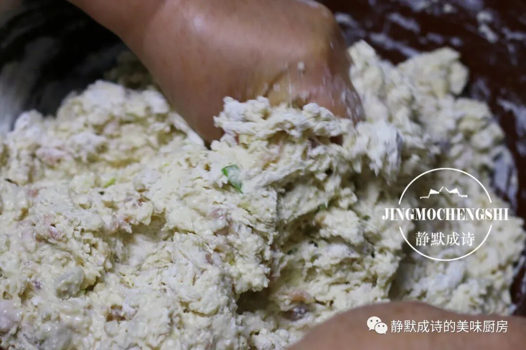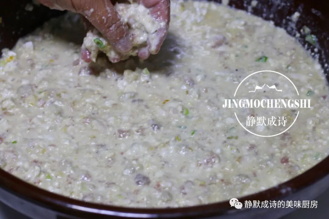11、继续用手搅拌,这里不建议用其他工具代替,只有用手搅拌才会均匀,直到把丸子糊搅拌均匀。