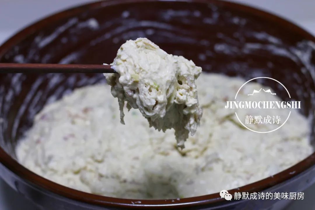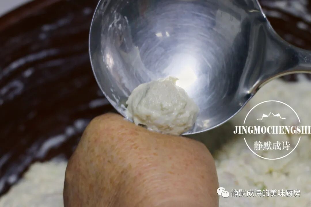 12、最后的丸子面糊应该是比较稀软的,用筷子挑起来会迅速下垂但不会滴落。若是面糊硬的话,炸出来的丸子也会比较硬。