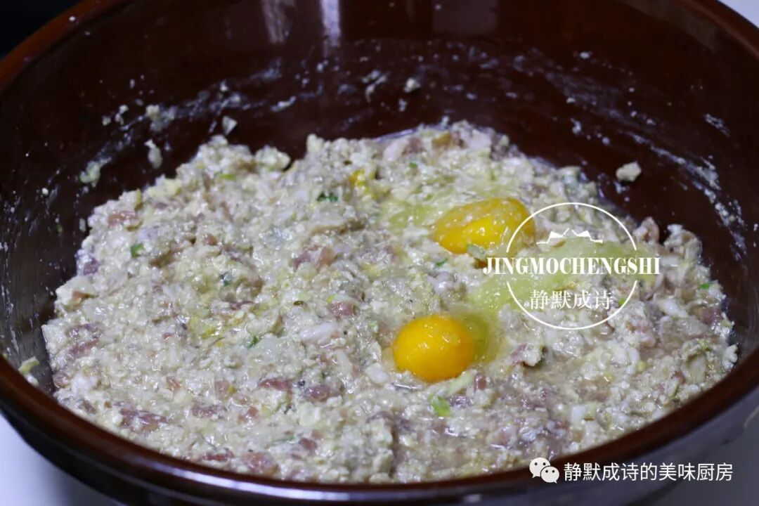 7、再磕入几个鸡蛋,这里前后放了5个鸡蛋,加入鸡蛋的丸子跟豆腐一样,炸时会更蓬松,丰富口感。