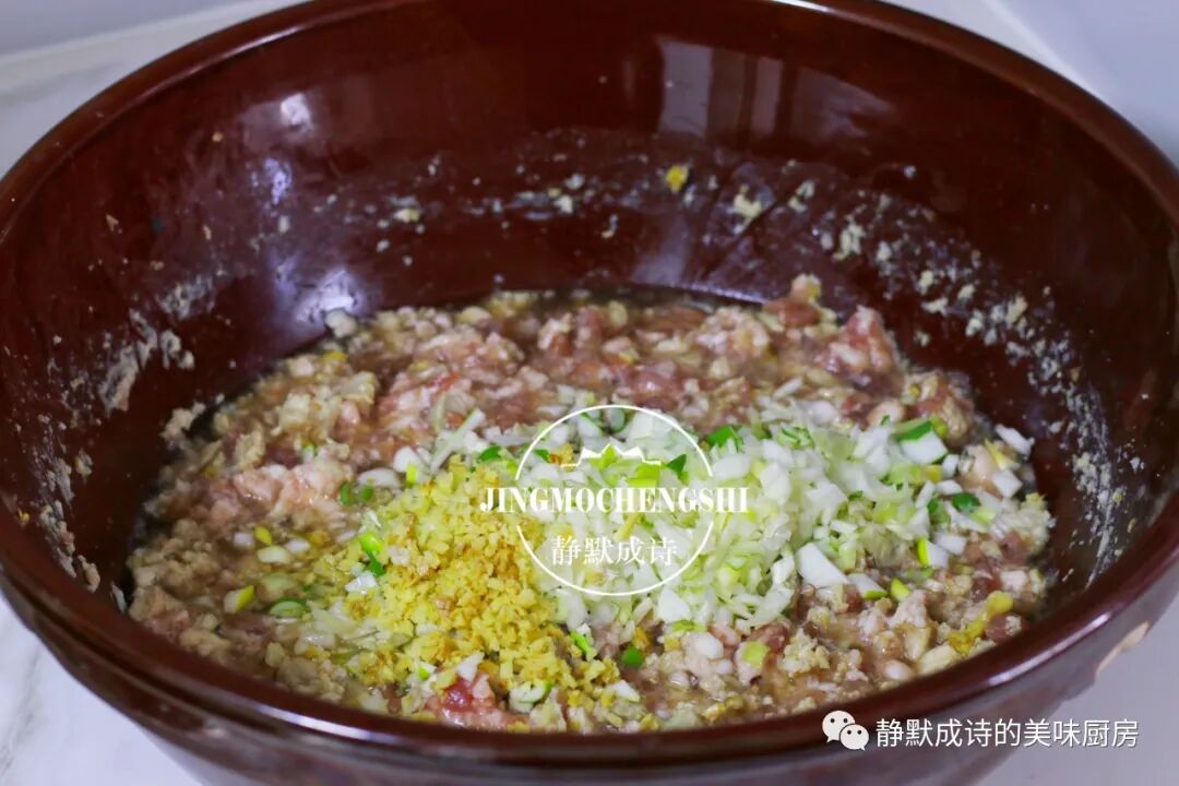 1、猪肉剁碎,加入高汤(母亲在煮肉和大骨头时总会把汤留下一部分来炸丸子用,所以,这个高汤是有各种香料味道的肉汤),把葱姜切碎放进去(这里建议大家改成葱姜水,因为葱姜会被炸糊,母亲听了我的建议之后说明年改成葱姜水)。
