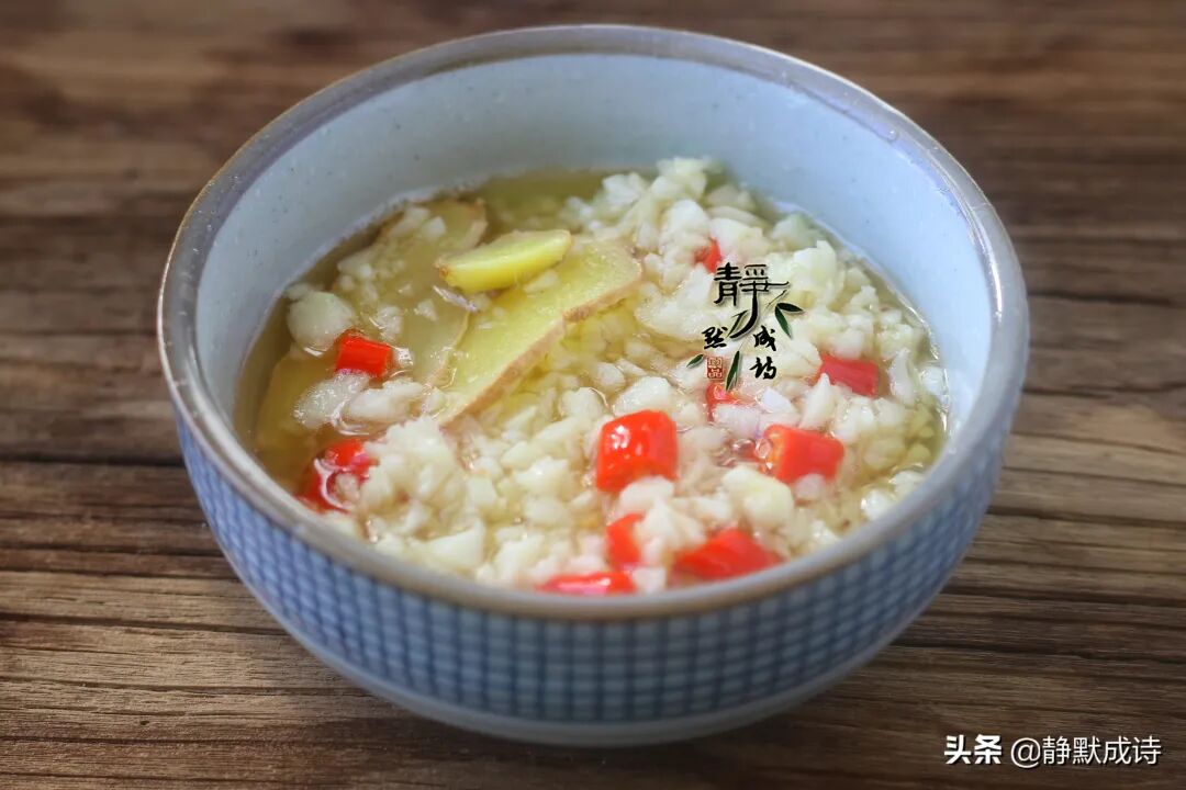 4、把小米辣和其余的蒜蓉、姜片放进碗中,油烧热之后浇上去激发出香味儿,做成蒜蓉油汁待用。