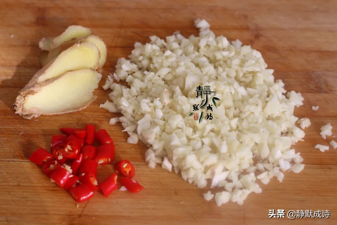2、大蒜拍碎剥皮切成蒜蓉,小米辣切圈,姜切片。