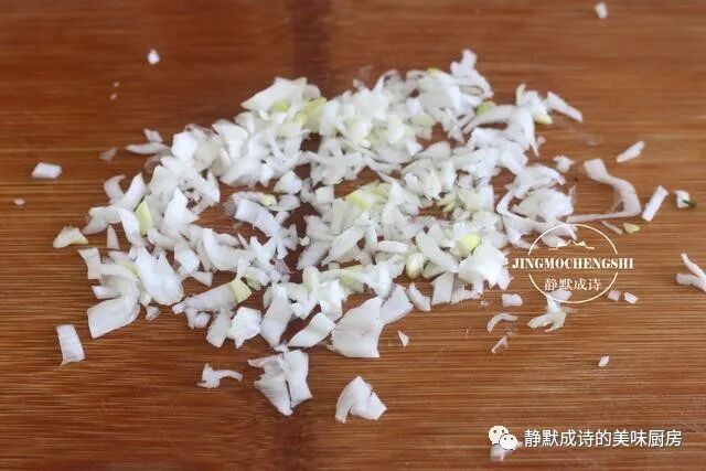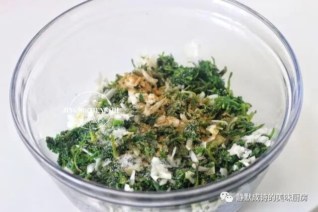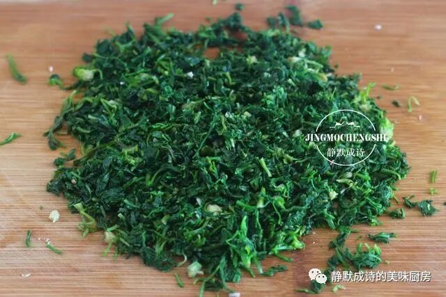 6、荠菜择净洗净,过开水焯烫至变色捞出,轻轻攥掉水分,切碎,然后把大葱也切碎,连同荠菜全部放进拌馅儿的大碗里。