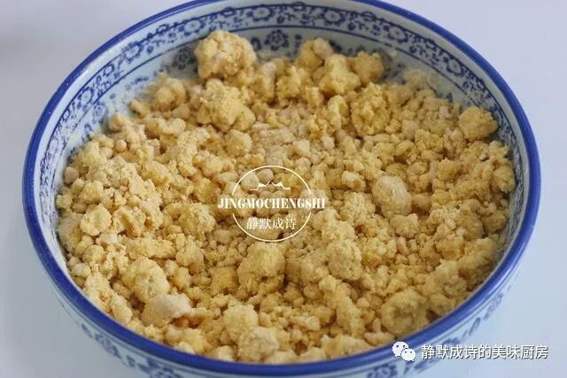2、先把三种面粉搅拌均匀,然后用温热的水把面粉淋湿,边淋水边用筷子搅拌至没有明显干面的小面疙瘩。最好是用热水,但又不能烫手,否则会把酵母杀死失去发酵功能。