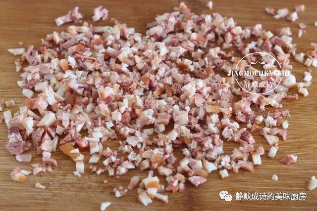 4、在面团发酵时,我们来准备做团子的馅料。我做的是荠菜猪肉团子,而猪肉用的是卤熟后的猪头肉,冰箱里正好有一小块儿,就随手拿出来用了。大家完全可以用新鲜猪肉馅儿,最好稍稍带点儿肥。