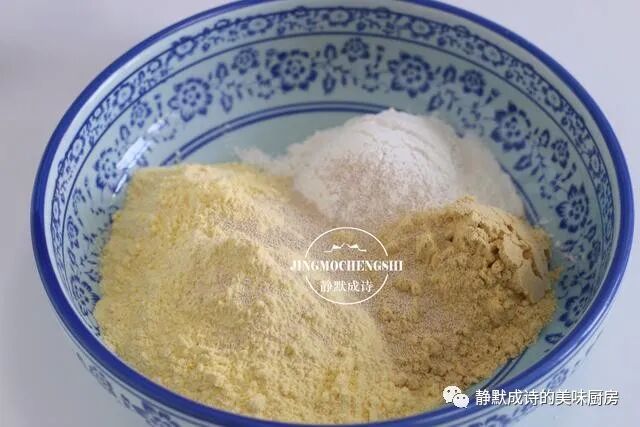 1、把玉米面、面粉和豆面按2:1:1的比例放进面盆中,加入4克酵母。因为玉米面几乎没有粘性,所以要加些面粉来人为地增加粘性,豆面是黄豆面,加一些豆面,团子的营养更全面,而且它能给团子增加香味儿。我用的豆面是炒过的,前几天做驴打滚时用剩的,不浪费。