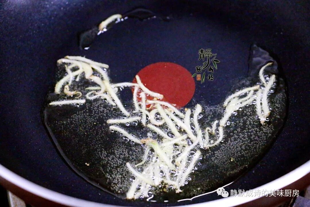 6、热锅热油,先下姜丝小火煸香。如果担心吃到姜丝影响口感,可以再煸炒过后捞出不要。