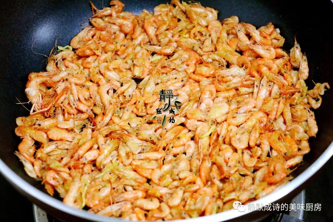 7、接着倒入裹了玉米面的小河虾,大火翻炒,直到虾变红变色。